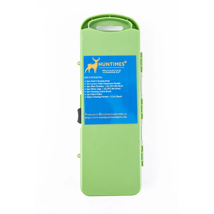 हमारा 9MM/.357/.38/.40/.44/.45 कैलिबर क्लीनिंग किट आपकी पिस्तौल के लिए डिज़ाइन किया गया है और इसमें OEM कस्टम ग्रिप लोगो और पैकेजिंग है। यह बहुमुखी सफाई किट शिकार के शौकीनों के लिए बिल्कुल उपयुक्त है और आपकी विशिष्ट आवश्यकताओं के अनुरूप सहायक उपकरणों के एक सेट के साथ आती है। किट में दो पीतल की सफाई छड़ें, एक टिकाऊ प्लास्टिक हैंडल, एक सफाई नायलॉन ब्रश, पच्चीस सफाई पैच, विभिन्न कैलिबर के चार कक्ष ब्रश, चार पीतल के सेरेशंस, एक प्लास्टिक पैच खींचने वाला और एक पीतल पैच खींचने वाला शामिल है।